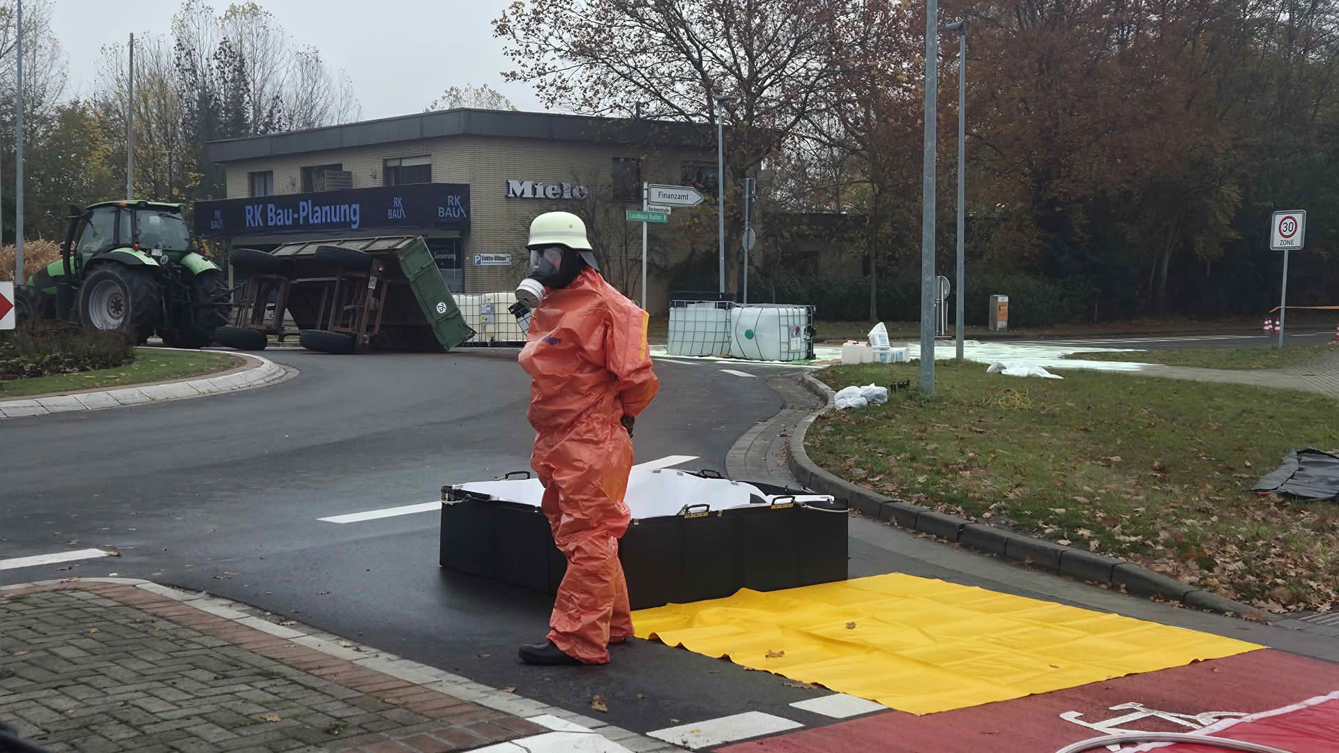 Beim Eintreffen der ersten KrĂ€fte am Kreisel an der B71 lag ein AnhĂ€nger eines Taktors im Kreisverkehr auf der Seite. Der AnhĂ€nger war mit vier IBC-Containern beladen, die PropionsĂ€ure enthielten. Zwei der BehĂ€lter waren beschĂ€digt, wodurch gröĂere Mengen FlĂŒssigkeit austraten. Der Fahrer hatte eigenstĂ€ndig versucht, das Ausbreiten der SĂ€ure zu verhindern, und zog sich dabei VerĂ€tzungen im Gesichtsbereich zu. Er wurde vom Rettungsdienst versorgt und anschlieĂend in eine Klinik nach Bremen transportiert.