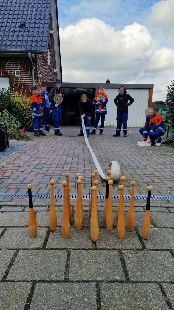 Berühmt und berüchtigt in der Welt der Jugendfeuerwehr: das Schlauchkegeln. Ziel ist es, einen Schlauch so präzise auszurollen, dass man alle aufgebauten Kegel umwirft, um so möglichst viele Punkte zu erreichen. Nach abgeschlossener Aufgabe ging es von hier aus, natürlich mit neuen Fragen im Gepäck, weiter. Unterwegs mussten wieder einige Fragen geklärt werden, bis die nächste Station kam. An dieser waren die Fußballer unter den Jugendfeuerwehr-Mitgliedern gefragt.