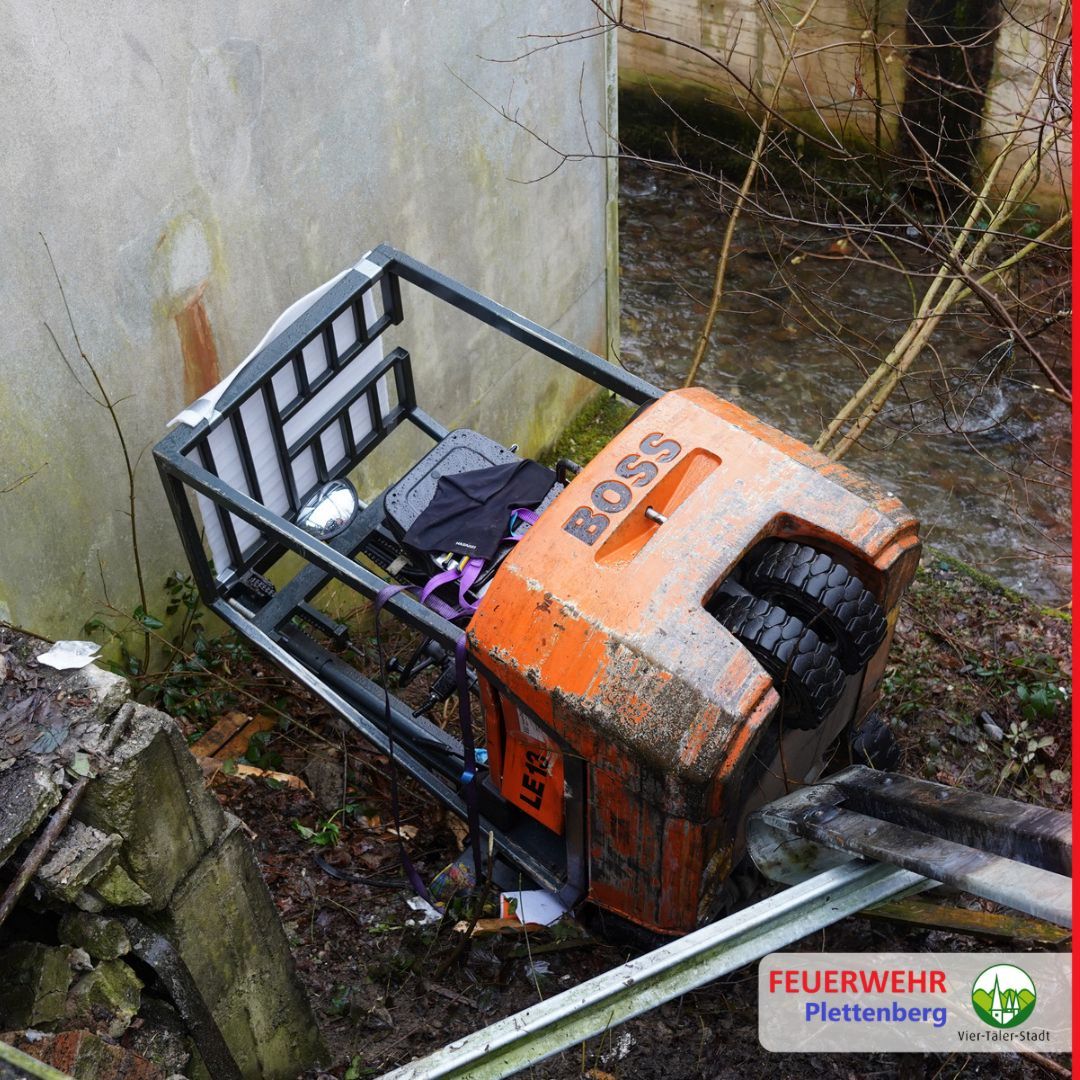 An einem Betrieb an der Kroppstraße war, aus für die Feuerwehr ungeklärter Ursache, ein Gabelstapler durch eine Leitplanke gebrochen und in Richtung Bachbett abgestürzt. Der Fahrer des Gabelstaplers war beim Eintreffen der Feuerwehr glücklicherweise nicht eingeklemmt.