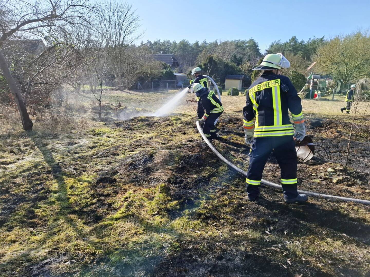 Das Feuer drohte auf anliegende Gebäude überzugreifen. Durch den schnellen und gezielten Löscheinsatz der Feuerwehr konnte ein Übergreifen glücklicherweise verhindert werden. Es brannte eine Grasfläche von rund 600qm. Die Polizei hat die Brandstelle aufgenommen.