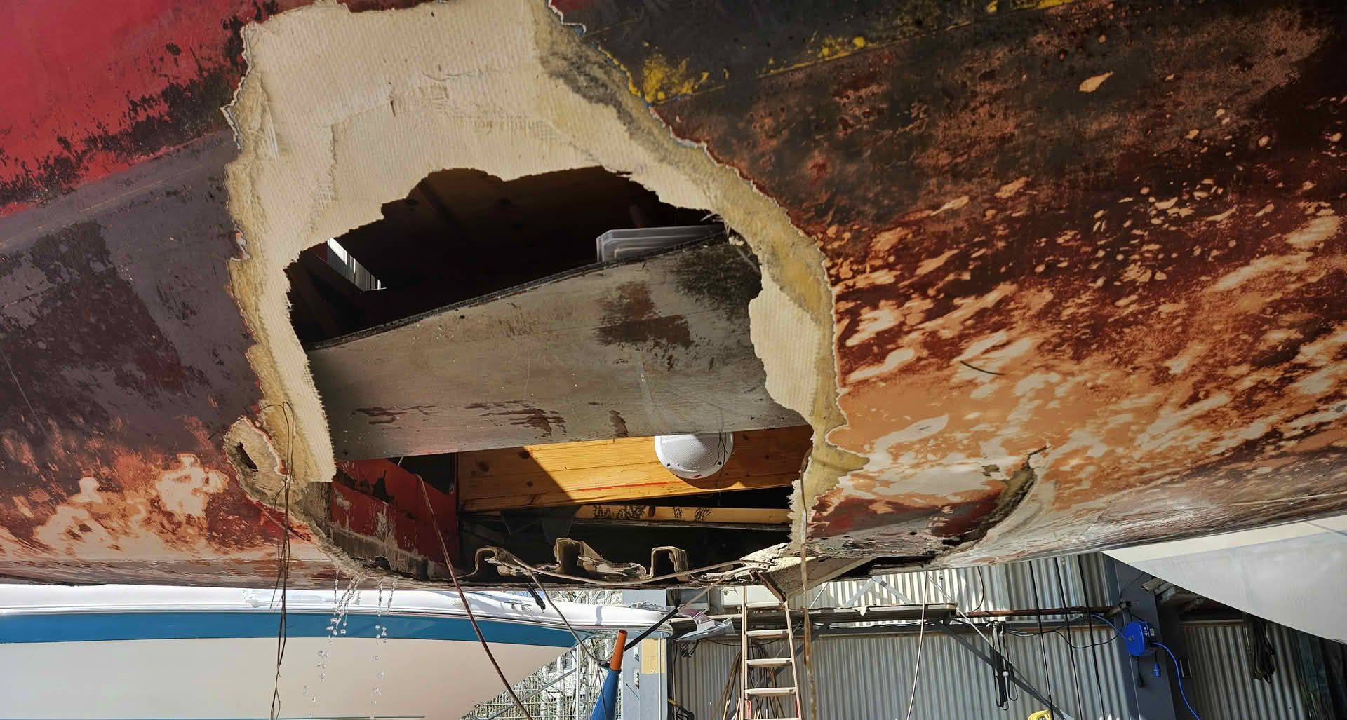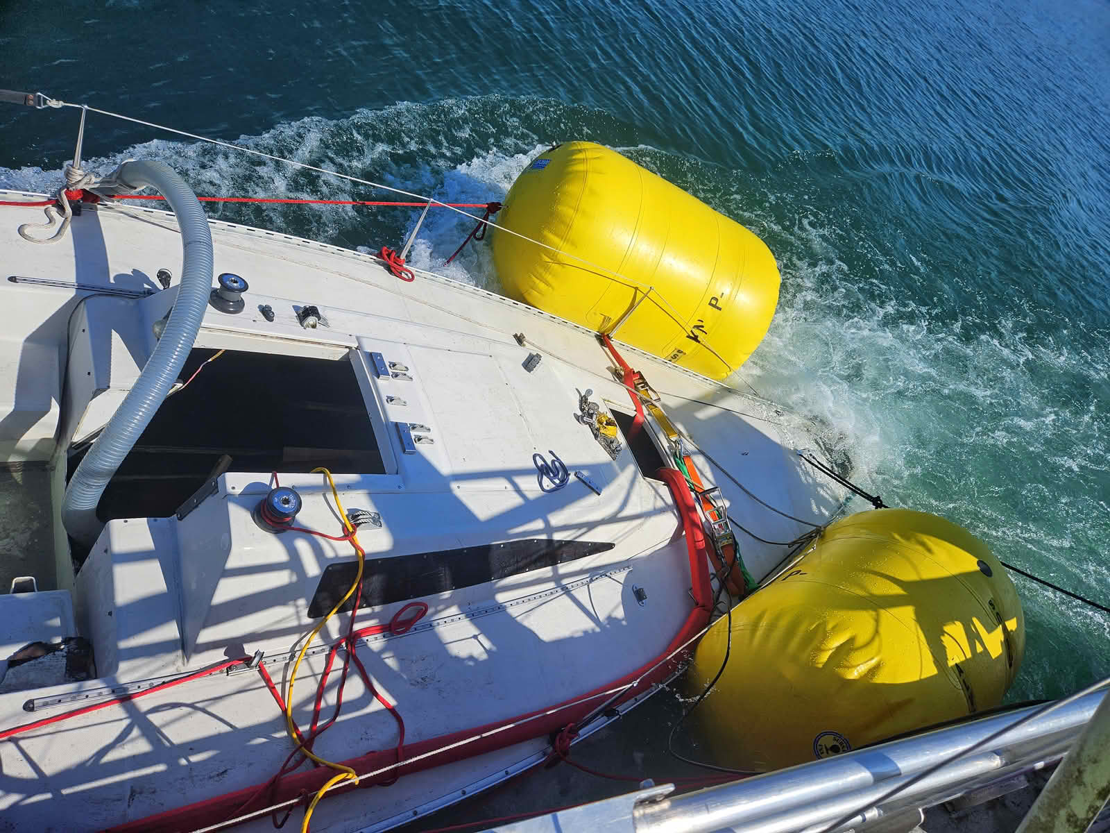 Das Segelboot konnte so aus dem Flachwasserbereich verbracht werden. Erst im tieferen Wasser war das ganze Ausmaß der Schäden am Rumpf sichtbar. Der Kiel war vollständig abgerissen, und durch die Wellen war ein Loch von fast zwei Quadratmetern in den Rumpf gerissen worden. Dies hatte zur Folge, dass der Havarist ohne Hebesäcke nicht mehr selbstständig schwimmen konnte.