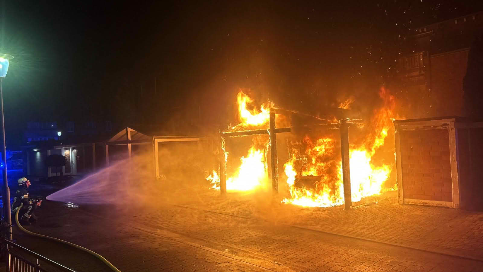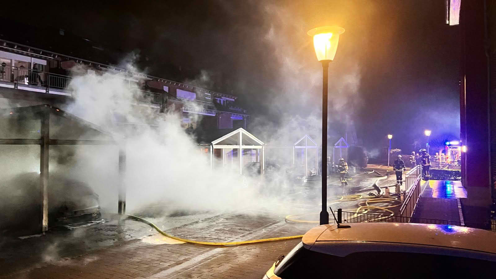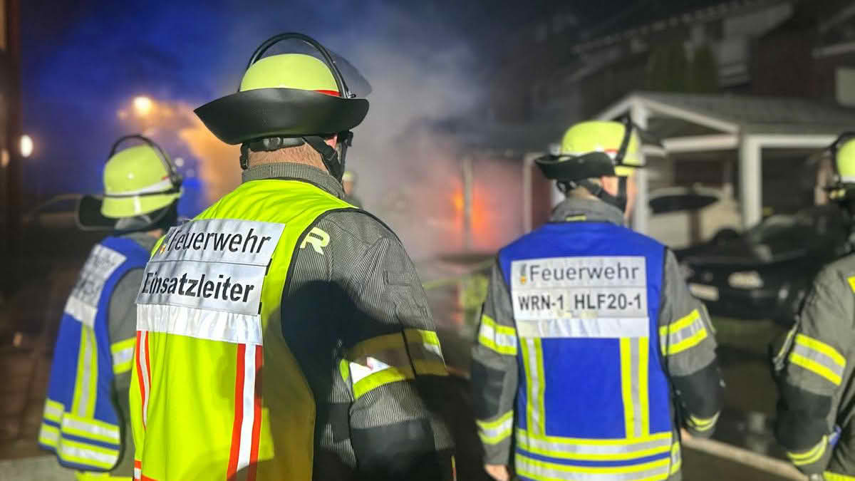 Beim Eintreffen der ersten Einsatzkräfte standen ein Doppelcarport sowie ein darunter abgestellter PKW bereits in Vollbrand. Wenige Meter entfernt brannten zudem mehrere Mülltonnen an einer Hauswand. Aufgrund der Nähe zu angrenzenden Gärten und Schuppen bestand die Gefahr einer weiteren Brandausbreitung.