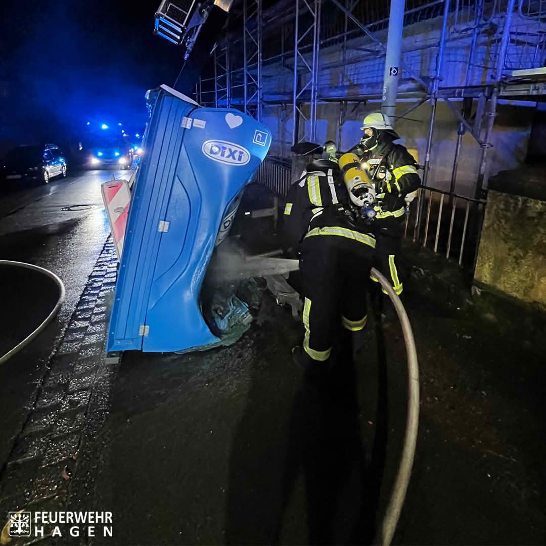 Die Feuerwehr Hagen wurde am Samstagabend gegen 22:30 zu einem Brand in die Heidestraße alarmiert. Gemeldet wurde ein brennendes Baustellen WC vor einem Wohngebäude.