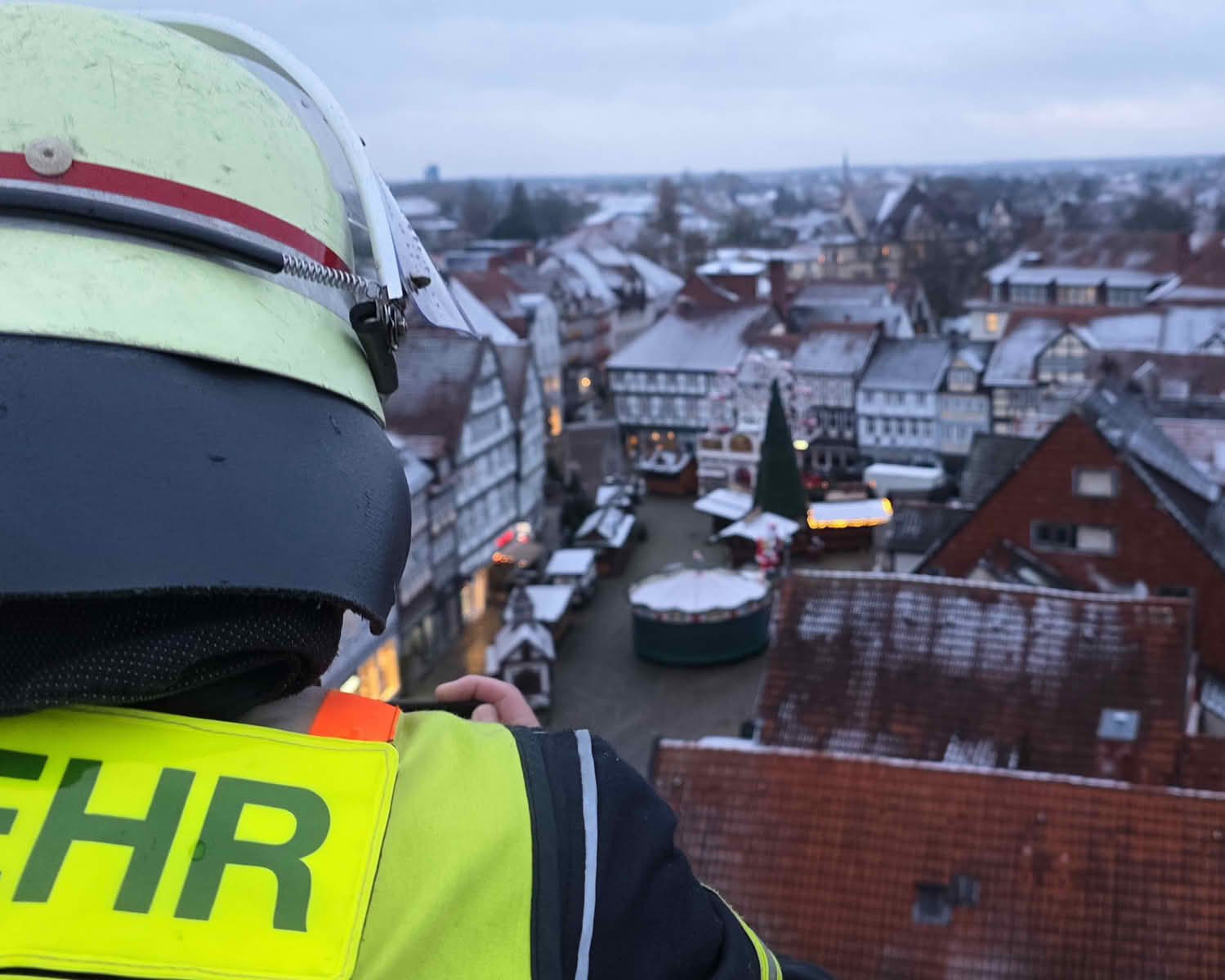 Doch auch zur Weihnachtsmarktzeit ist die hohe Brandlast der Celler Altstadt nicht zu vergessen. Wie in den vergangenen Jahren führten wir daher auch in diesem Jahr eine Befahrung durch. Mit einer Drehleiter wurde die allgemeine Befahrbarkeit des Marktes sowie an Schwerpunkten die Anfahrt zu Aufstellungspunkten der Drehleitern geprobt. Diese Punkte sind notwendig, um die umliegende Bebauung mit der Drehleiter zu erreichen. Am Ende stand es dann fest, es passt!