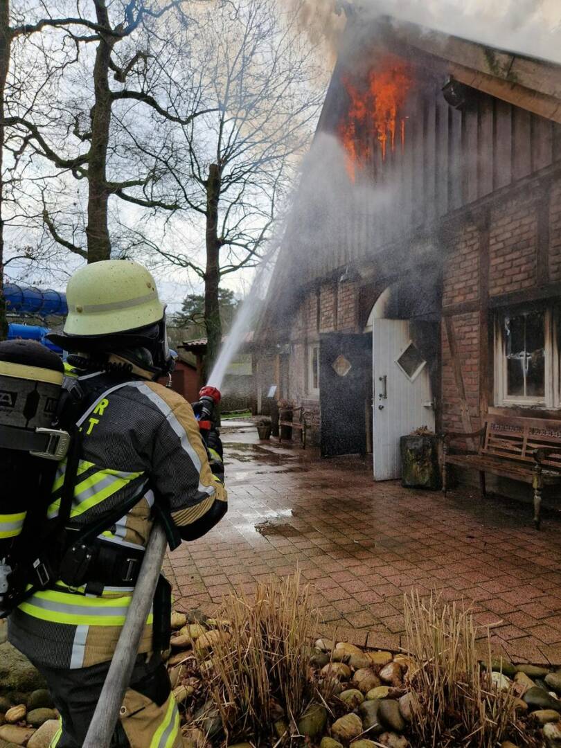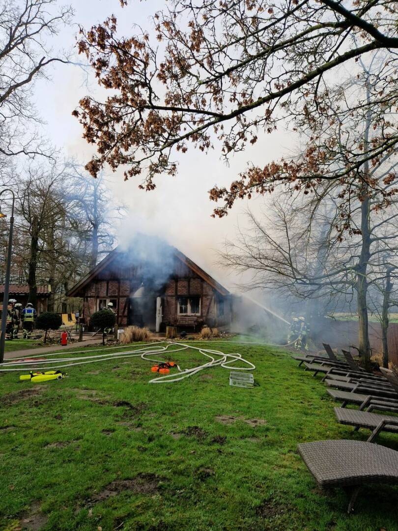 Vor Ort brannte ein freistehendes Saunagebäude in voller Ausdehnung. Die Feuerwehr setzte gleichzeitig drei Strahlrohre mit Einsatzkräften unter Atemschutz ein und bekämpfte erfolgreich den Brand. Ein Übergreifen auf weitere Gebäude konnte dadurch verhindert werden.