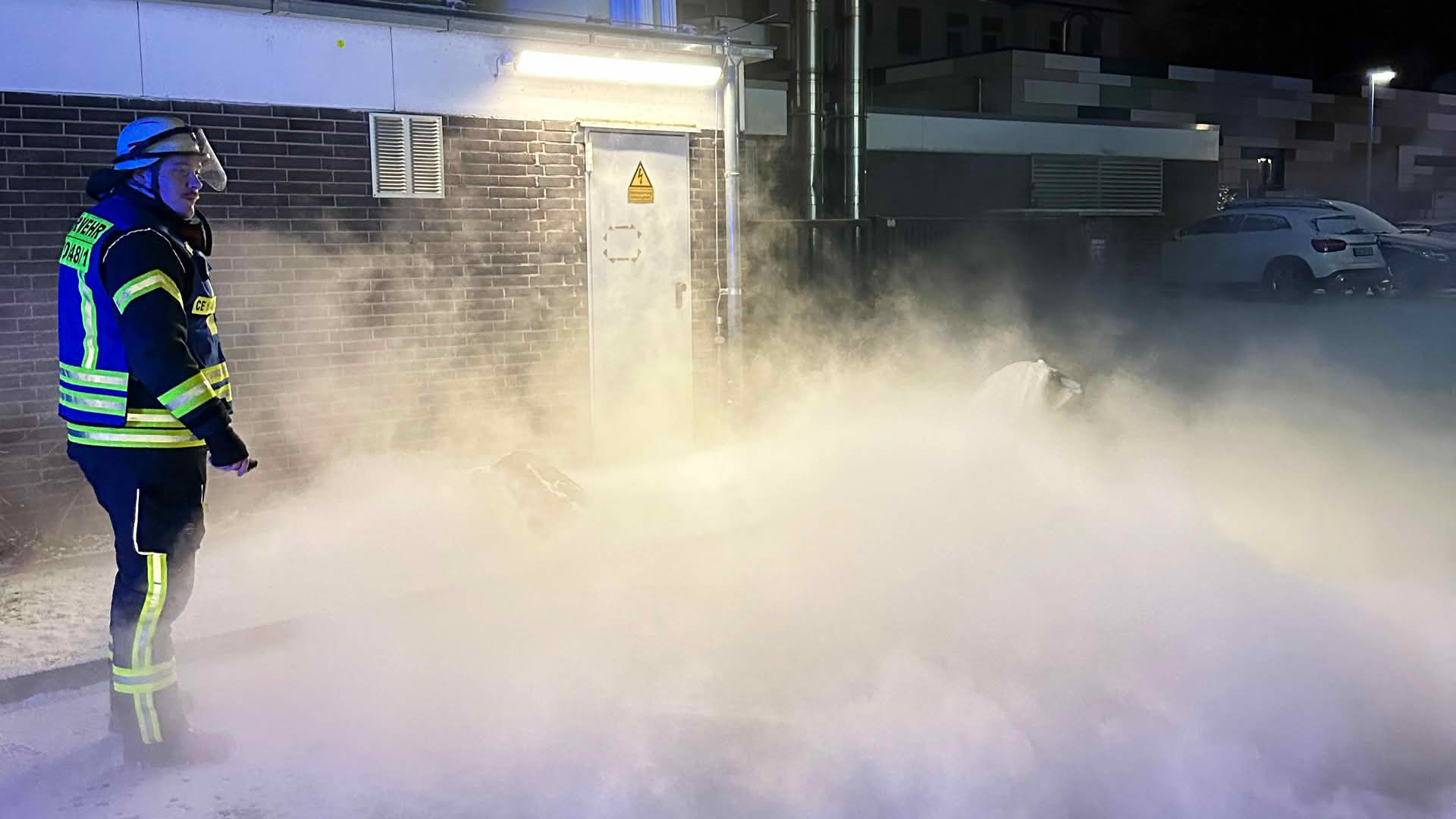 Bei Eintreffen der Feuerwehr stellten die Einsatzkräfte jedoch eine nicht alltägliche Szenerie fest. Im Bereich der Einsatzstelle zogen Nebelschwaden über den Boden, so wie man es aus manchen Gruselfilmen kennt. Des Rätsels Lösung war dann schnell gefunden. Die Feuerwehrleute stellten einen Austritt von medizinischem Sauerstoff aus einem entsprechenden Tank fest. Eine Gefahr bestand nicht und für die Feuerwehr war kein weiterer Einsatz erforderlich.