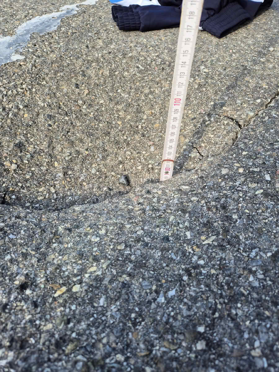 Vor Ort wurde die Einsatzstelle zunächst provisorisch abgesichert. Bei der weiteren Erkundung konnte festgestellt werden, dass sich unterhalb des Fahrbahnbelags bereits ein Hohlraum von ca. 1 m³ gebildet hatte. Eine defekte Rohrleitung konnte als vermutlicher Grund festgestellt werden.