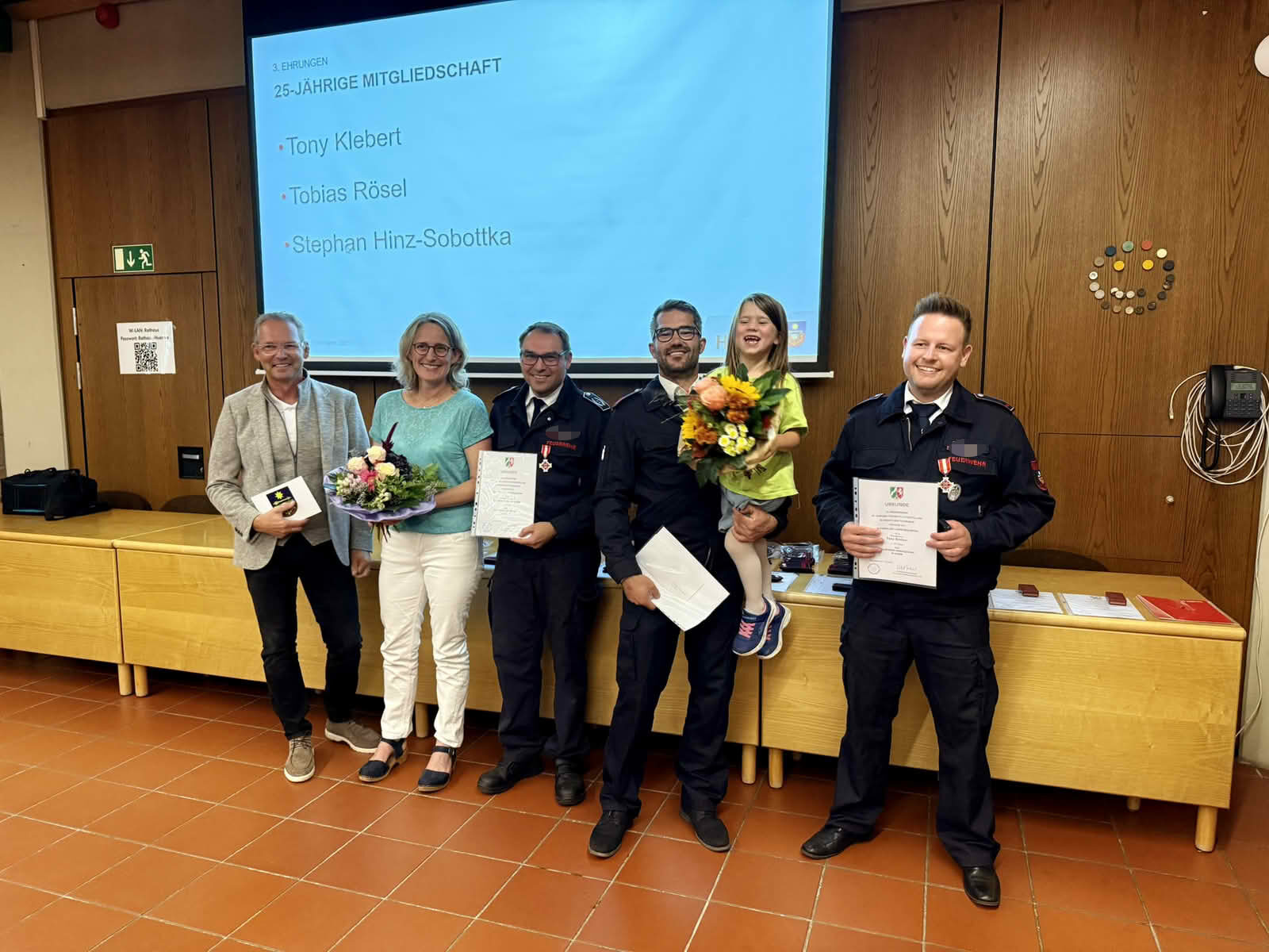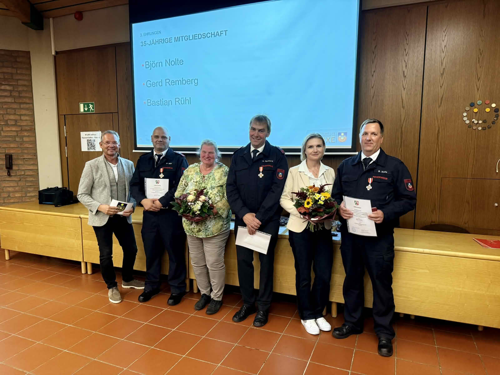 Für ihre zehnjährige Mitgliedschaft in der Freiwilligen Feuerwehr wurden Daniel Bader und Nick Hinterreiter vom Verband der Feuerwehren in Nordrhein-Westfalen mit einer Urkunde und einer Ehrennadel geehrt. Für 25-jährige Mitgliedschaft überreichte Bürgermeister Dirk Buschmann Tony Klebert, Tobias Rösel und Stephan Hinz-Sobottka die silberne Ehrennadel des Landes Nordrhein-Westfalen und eine Urkunde. Für ihre 35-jährige ehrenamtliche Mitgliedschaft wurden Björn Nolte, Gerd Remberg und Bastian Rühl mit der Ehrennadel in Gold und ebenfalls einer vom Innenminister Herbert Reul unterschriebenen Urkunde des Landes Nordrhein-Westfalen ausgezeichnet.
