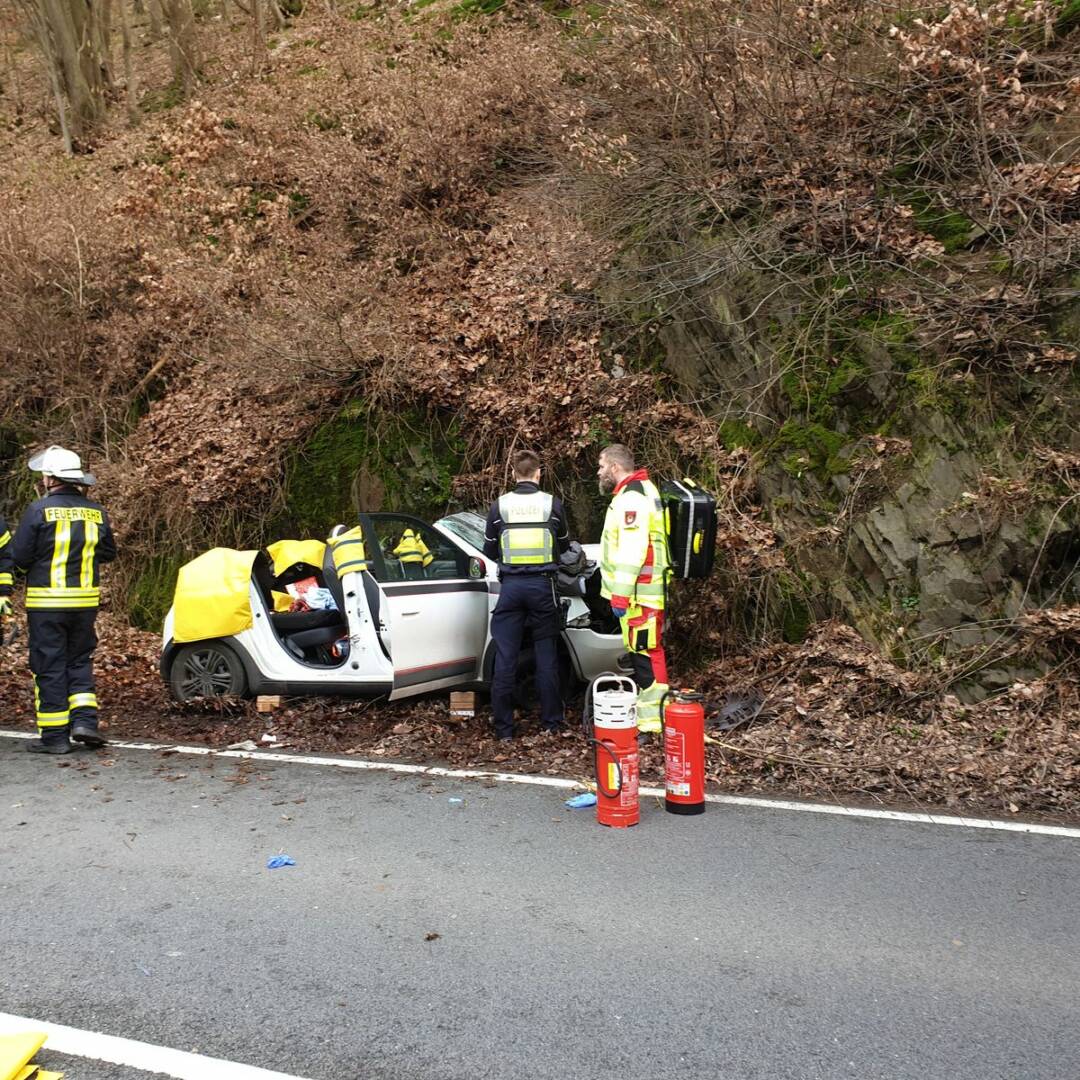 Kurz nach der Ortsgrenze zu Hagen fuhr ein PKW-Fahrer auf der B45/Volmestraße in Fahrtrichtung Schalksmühle. Er kam von der Fahrbahn ab und prallte gegen einen Felsen.